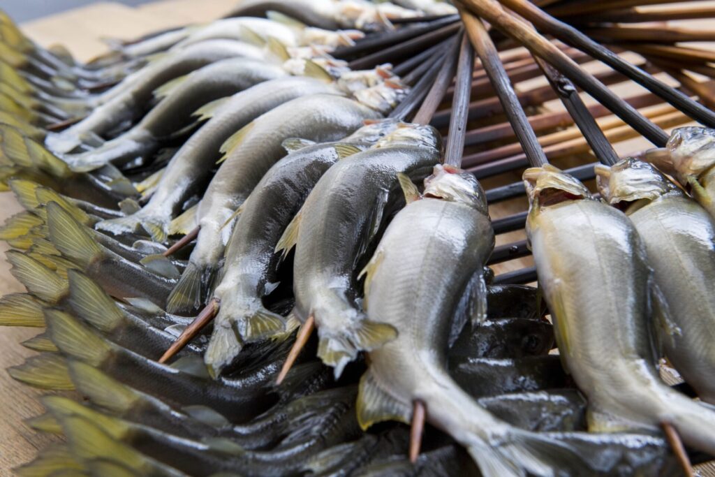 | 鮎料理のこだわり | 遠火の炭火でじっくり焼きあげているため、頭から骨まで丸ごと召しあがって頂けます。一本一本丁寧に串刺しし、スタッフがこだわり焼きあげています。 |